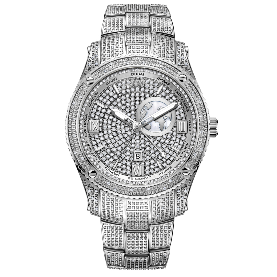Stainless steel case with a stainless steel bracelet. Fixed stainless steel bezel. Silver (diamond pave) dial with luminous silver-tone sword-shaped hands and index hour markers. Roman numerals appear at the 3, 6 and 9 o'clock positions. From Dubai to New York City, the city dial track and GMT hand easily keeps two different time zones. Dial Type: Analog. Luminescent hands and markers. Date display above the 6 o'clock position. Ronda caliber 505.24H quartz movement. Scratch resistant mineral crystal. Pull / push crown. Solid case back. Round case shape. Case size: 46 mm. Case thickness: 13 mm. Band width: 24 mm. Band length: 8.5 inches. Fold over clasp with a safety release. Water resistant at 50 meters / 165 feet. Functions: day, GMT, second time zone, hour, minute, second. Additional Info: 100 genuine diamonds. Jet Setter Gmt Series. Luxury watch style. Watch label: Swiss Movt. Jbw Jet Setter GMT Quartz Diamond Silver Dial Mens Watch J6370B.