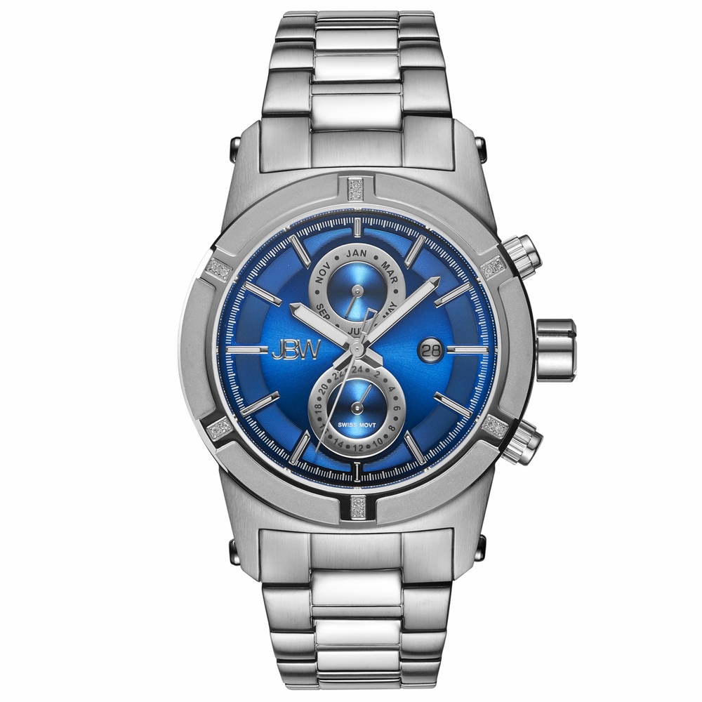 Stainless steel case with a stainless steel bracelet. Fixed diamond bezel. Blue dial with silver-tone hands and index hour markers. Minute markers around the outer rim. Dial Type: Analog. Date display at the 3 o'clock position. Two - month and 24 hour. Quartz movement. Scratch resistant mineral crystal. Pull / push crown. Solid case back. Case size: 44 mm. Case thickness: 8 mm. Round case shape. Band width: 24 mm. Band length: 8.5 inches. Deployment with push button clasp. Water resistant at 50 meters / 165 feet. Functions: date, day, GMT, hour, minute, second. Dress watch style. JBW Strider Stainless Steel Case Blue Dial Diamond Bezel Mens Watch J6263J.