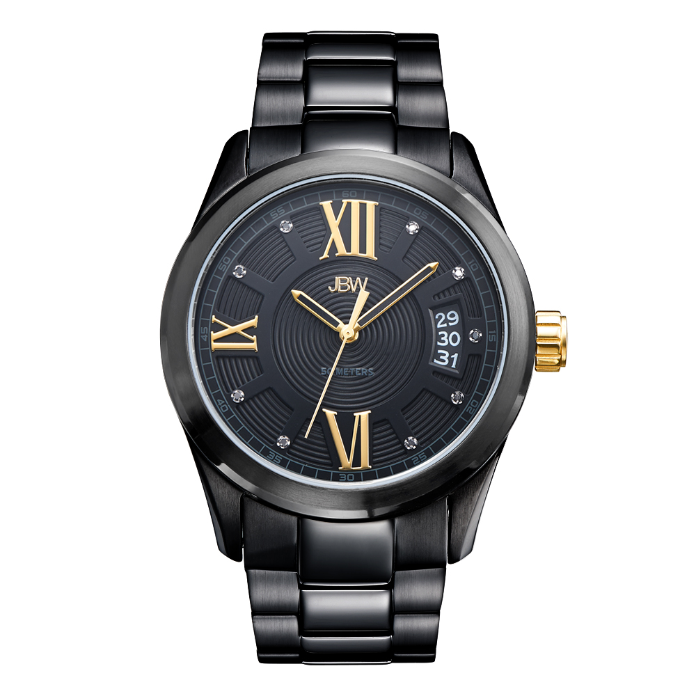Black ion-plated stainless steel case with a black ion-plated stainless steel bracelet. Fixed bezel. Black dial with gold-toned hands and diamond index and Roman hour markers. Minute markers around the outer rim. Dial Type: Analog. Date display at the 3 o'clock position. Quartz movement. Scratch resistant mineral crystal. Case diameter: 44 mm. Round case shape. Water resistant at 50 meters / 165 feet. Functions: date, hour, minute, second. Dress watch style. JBW Bond Black Dial Black IP Stainless Steel Mens Watch J6311E.