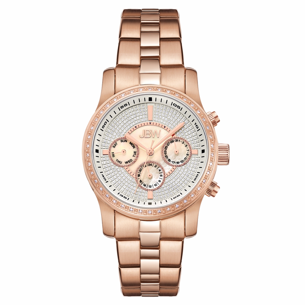 Rose gold-tone stainless steel case with a rose gold-tone stainless steel bracelet. Fixed bezel. Mother of pearl crystal dial with silver-tone hands and index hour markers. Minute markers around the outer rim. Dial Type: Analog. Day of the week and date display at the 3 o'clock position. Three - day, date, and 24 hour. VD53 quartz movement. Scratch resistant mineral crystal. Pull / push crown. Solid case back. Case size: 38 mm. Case thickness: 13 mm. Round case shape. Band width: 18 mm. Band length: 7.5 inches. Deployment with push button clasp. Water resistant at 50 meters / 165 feet. Functions: date, day, hour, minute, second. Casual watch style. JBW Vixen Mother of Pearl Crystal Dial Rose Gold-tone Bracelet Diamond Bezel Ladies Watch J6327C.