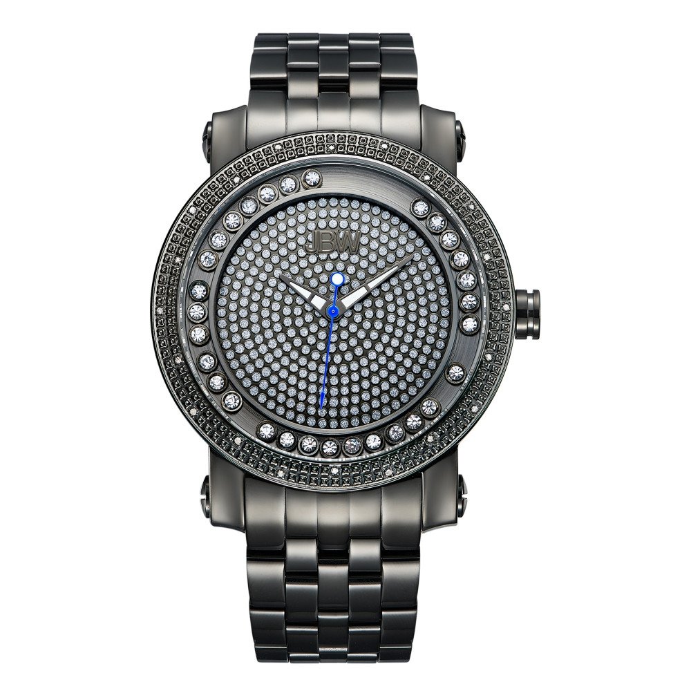 Gunmetal-plated stainless steel case with a gunmetal-plated stainless steel bracelet. Fixed, diamond-set bezel. Black dial with grey-tone hands. Dial Type: Analog. Quartz movement. Scratch resistant mineral crystal. Solid case back. Case size: 50 mm. Case thickness: 11 mm. Round case shape. Band width: 23.5 mm. Band length: 8.5 inches. Deployment clasp. Water resistant at 50 meters / 165 feet. Functions: hour, minute, second. Additional Info: dial features floating crystals. bezel is set with 30 diamonds. Casual watch style. JBW Hendrix Gunmetal-Plated Diamond Mens Watch J6338C.