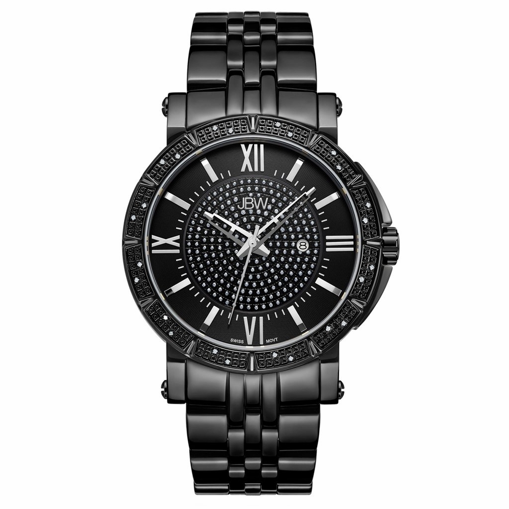 Black ion-plated stainless steel case and bracelet. Fixed black ion-plated bezel set with diamondsl. Black (diamond pave) dial with silver-tone skeleton hands and index hour markers. Roman numerals mark the 3, 6, 9 and 12 o'clock positions. Minute markers around an inner ring. Dial Type: Analog. Date display at the 3 o'clock position. Quartz movement. Scratch resistant mineral crystal. Pull / push crown. Solid case back. Round case shape. Case size: 47 mm. Case thickness: 11 mm. Band width: 24 mm. Deployment clasp with a push button release. Water resistant at 100 meters / 330 feet. Functions: date, hour, minute, second. Dress watch style. Watch label: Swiss Movt. JBW Vault Black Ion-plated Diamond Mens Watch J6343D.