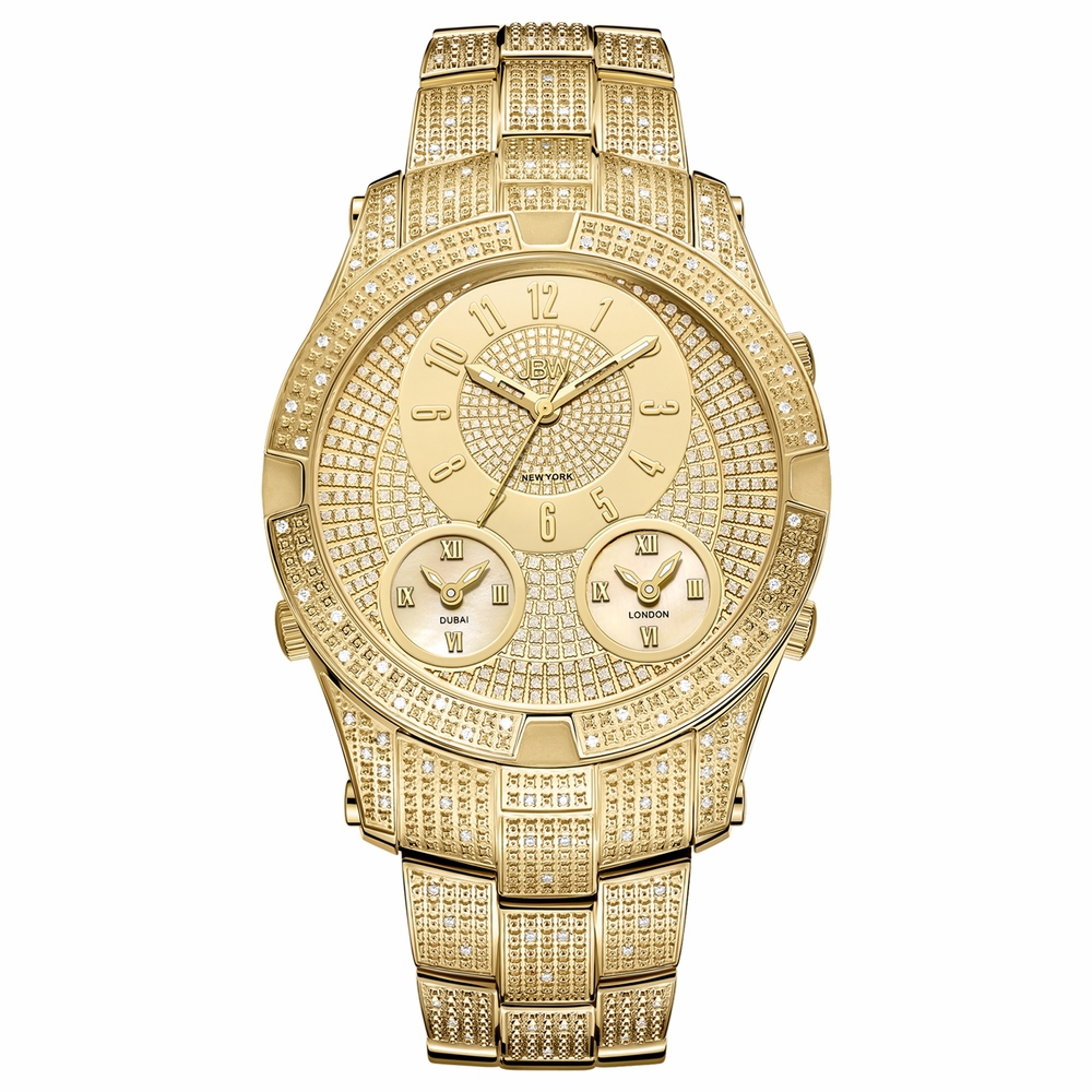 Gold-tone 18k gold-plated stainless-steel case with a gold-tone 18k gold-plated stainless steel bracelet. Fixed gold-tone crystal set bezel. Gold dial with gold-tone hands and Arabic numeral hour markers. Dial Type: Analog. Two - 12 hour, 12 hour subdials. Quartz movement. Scratch resistant mineral crystal. Pull / push crown. Round case shape, case size: 46 mm, case thickness: 11 mm. Band width: 24 mm, band length: 8.5 inches. Fold over clasp. Water resistant at 50 meters / 165 feet. Functions: second time zone, hour, minute, second. Dress watch style. JBW Mens Jet Setter III 1.18 ctw Diamond 18k gold-plated stainless-steel Watch J6348A.