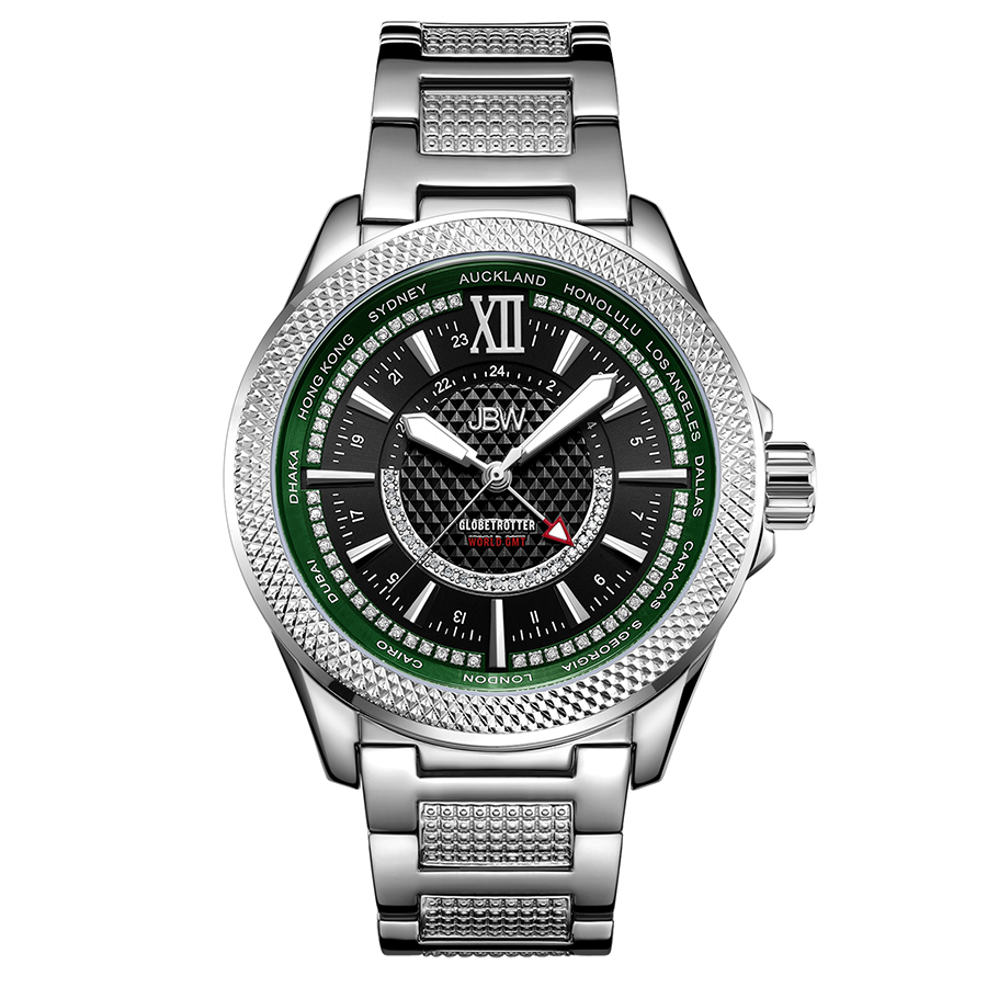 Silver stainless steel case with a silver stainless steel bracelet. Silver silver-tone stainless steel bezel. Black dial with silver-tone hands and Roman numeral and index hour markers. Dial Type: Analog. Luminescent hands. Quartz movement. Scratch resistant mineral crystal. Solid case back. Round case shape, case size: 47 mm, case thickness: 12 mm. Band width: 24 mm, band length: 8.5 inches. Fold over with double push button clasp. Water resistant at 50 meters / 165 feet. Functions: GMT, second time zone, hour, minute, second. Additional Info: 21 diamonds - .21 ctw. Dress watch style. Watch label: Swiss Movt. JBW Mens 10 YR Anniversary GMT Globetrotter 0.21 ctw Diamond Watch J6365-10A.