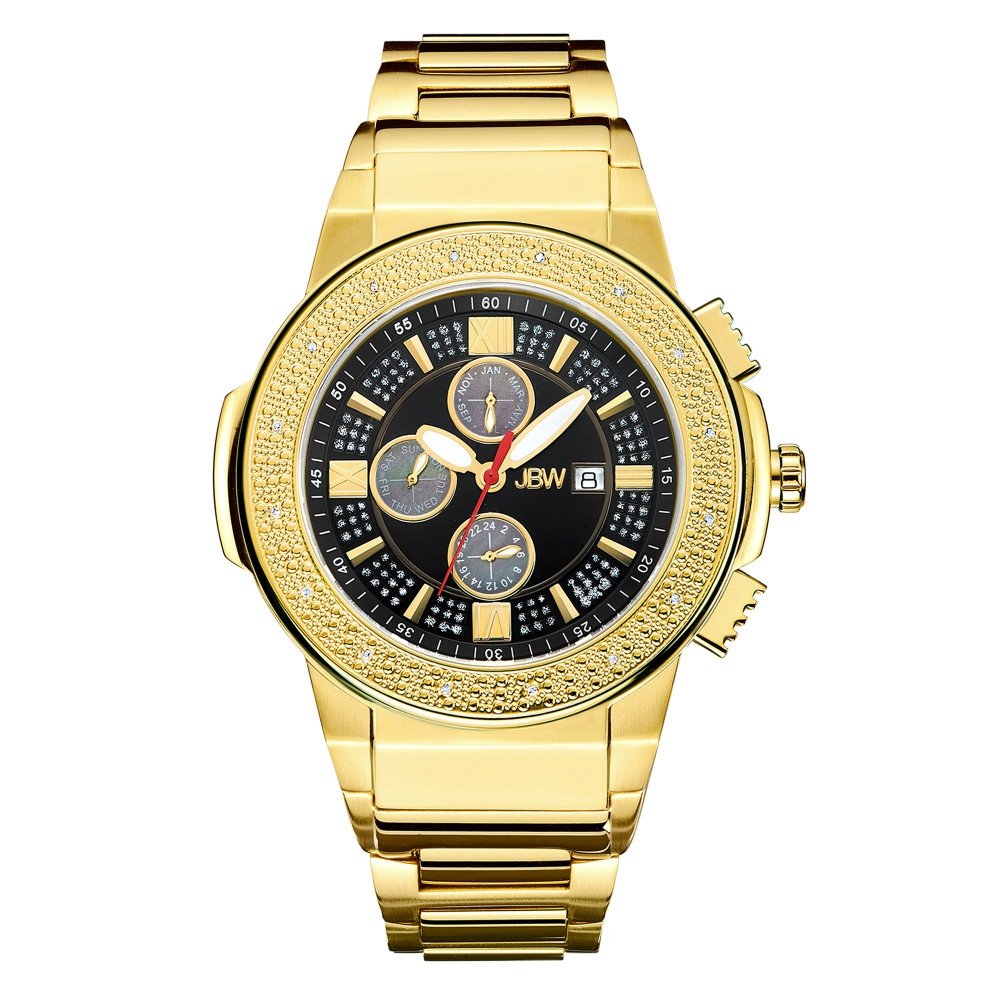 18k gold-plated stainless steel case with a 18k gold-plated stainless steel bracelet. Fixed, diamond-set bezel. Black dial with gold-tone hands and index hour markers. Minute markers around the outer rim. Dial Type: Analog. Date display at the 3 o'clock position. Three - month, day and 24 hour sub-dials. Quartz movement. Scratch resistant mineral crystal. Solid case back. Case size: 46 mm. Case thickness: 13 mm. Round case shape. Band width: 22 mm. Band length: 8.5 inches. Deployment clasp. Water resistant at 100 meters / 330 feet. Functions: month, date, day, hour, minute, second. Dress watch style. JBW Saxon Black Dial 18K Yellow Gold-Plated Stainless Steel Diamond Mens Watch JB-6101-J.