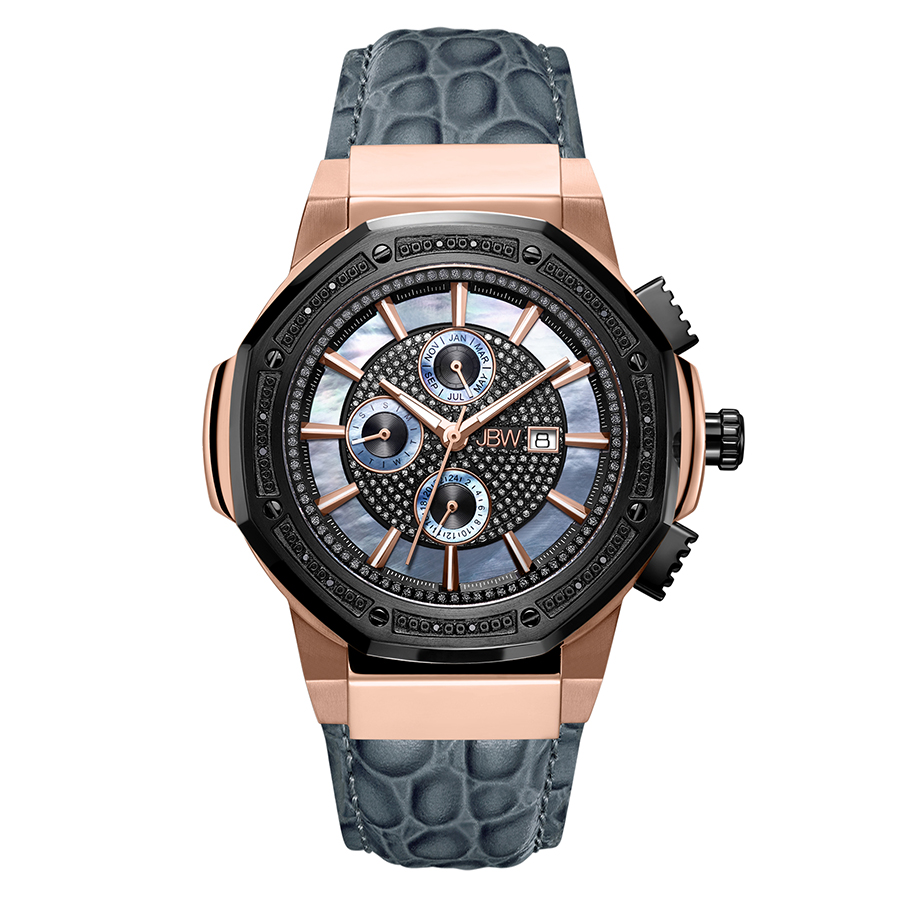 Rose gold 18k gold-plated stainless-steel case with a gray leather strap. Gold black stainless steel bezel. Black mother of pearl dial with rose gold-tone hands and index hour markers. Minute markers around the outer rim. Dial Type: Analog. Luminescent hands and markers. Date display at the 3 o'clock position. ISA Caliber 9232/1920 quartz movement. Scratch resistant mineral crystal. Solid case back. Round case shape, case size: 48 mm, case thickness: 13 mm. Band width: 22 mm, band length: 8.5 inches. Butterfly buckle with push buttons clasp. Water resistant at 100 meters / 330 feet. Functions: month, date, day, GMT, second time zone, hour, minute, second. Additional Info: 16 diamonds - 0.16 ctw. Dress watch style. Watch label: Swiss Movt. JBW Mens 10 YR Anniversary Saxon 0.16 ctw Diamond 18K Rose-gold Plated Watch JB-6101L-10C.