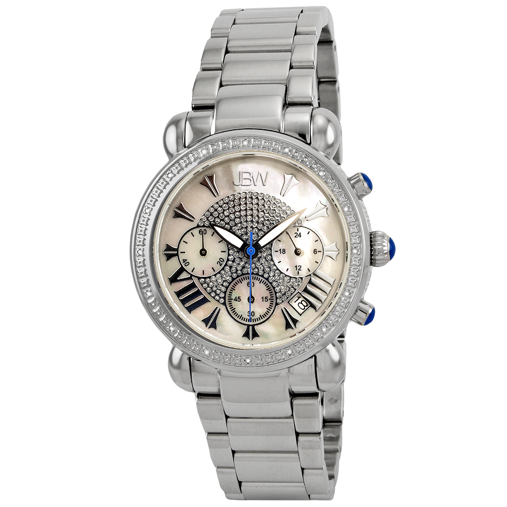 Stainless steel case with a stainless steel bracelet. Fixed stailess steel bezel set with diamonds. Mother of pearl crystal-set dial with black hands and Roman numeral / index hour markers. Dial Type: Analog. Date display between 4 and 5 o'clock position. Chronograph - three sub-dials displaying: 60 second, 60 minute and 24 hours. Hattori caliber VD53 quartz movement. Scratch resistant mineral crystal. Pull / push crown. Solid case back. Round case shape. Case size: 37 mm. Case thickness: 10.5 mm. Band width: 20 mm. Band length: 7.5 inches. Deployment clasp. Water resistant at 50 meters / 165 feet. Functions: chronograph, date, GMT, second time zone, hour, minute, second. Additional Info: total diamonds: 16. Victory Series. Dress watch style. Watch label: Japan Movt. Item Variations: 6210-D. JBW Victory Chronograph Mother of Pearl Dial Diamond Stainless Steel Ladies Watch JB-6210-D.