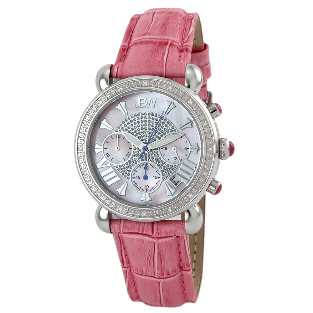 Stainless steel case with a pink leather strap. Fixed diamond bezel. Mother of pearl crystal-set dial with silver-tone hands and Roman numeral / index hour markers. Dial Type: Analog. Date display between 4 and 5 o'clock position. Chronograph - three sub-dials displaying: 60 second, 60 minute and 24 hours. VD53 quartz movement. Scratch resistant sapphire crystal. Pull / push crown. Solid case back. Case size: 37 mm. Case thickness: 10.5 mm. Round case shape. Band width: 20 mm. Band length: 7.5 inches. Deployment buckle clasp. Water resistant at 50 meters / 165 feet. Functions: chronograph, date, hour, minute, second. Additional Info: total diamonds: 16. Dress watch style. Item Variations: JB 6210L E, JB.6210L.E, JB6210LE. JBW Victory Diamond Bezel Chronograph Mother of Pearl Dial Pink Leather Strap Ladies Watch JB-6210L-E.