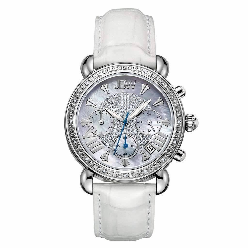 Silver-tone stainless steel case with a white genuine leather strap. Fixed silver-tone crystal set bezel. Mother of pearl dial with silver-tone hands and Roman numeral and index hour markers. Dial Type: Analog. Luminescent hands. Date display between 4 and 5 o'clock position. Chronograph - three sub-dials displaying: 60 second, 60 minute and 24 hour. Quartz movement. Scratch resistant mineral crystal. Pull / push crown. Round case shape, case size: 37 mm, case thickness: 7 mm. Band width: 20 mm, band length: 7.5 inches. Butterfly buckle clasp. Water resistant at 50 meters / 165 feet. Functions: chronograph, date, hour, minute, second. Dress watch style. JBW Ladies Victory 0.16 ctw Diamond Stainless Steel Watch JB-6210L-Q.