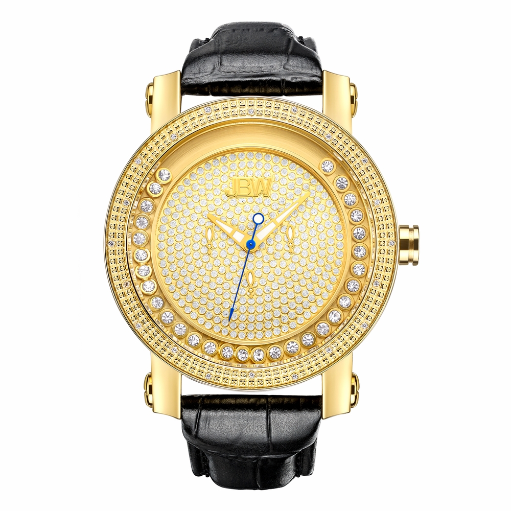 Gold-tone stainless steel case with a black leather strap. Fixed 20 diamond (0.25 ct) bezel. White crystal pave dial with silver-tone hands. Dial Type: Analog. Luminescent hands. Quartz movement. Scratch resistant sapphire crystal. Pull / push crown. Solid case back. Case size: 50 mm. Case thickness: 11 mm. Round case shape. Band width: 23.5 mm. Band length: 8.5 inches. Deployment buckle clasp. Water resistant at 50 meters / 165 feet. Functions: hour, minute, second. Dress watch style. JBW Hendrix Gold-tone Steel Case Black Leather Strap White Crystal Pave Dial Mens Watch JB-6211L-A.