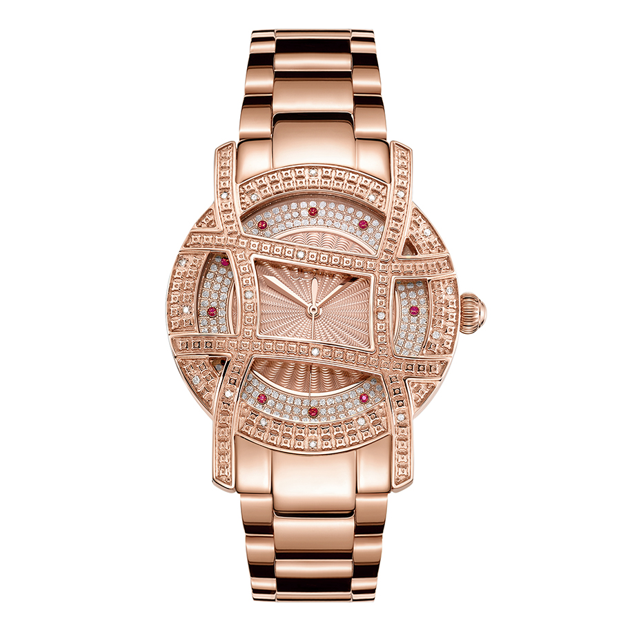 Rose gold-tone 18k rose gold-plated stainless-steel case with a rose gold-tone stainless steel bracelet. Fixed rose gold-tone diamond set bezel. Rose gold dial with rose gold-tone hands and diamond hour markers. Dial Type: Analog. Quartz movement. Scratch resistant sapphire crystal. Solid case back. Round case shape, case size: 38 mm, case thickness: 7 mm. Band width: 20 mm, band length: 7.5 inches. Hidden deployment clasp. Water resistant at 50 meters / 165 feet. Functions: hour, minute, second. Additional Info: 20 diamonds - 0.20 ctw / 12 swarovskis. Dress watch style. Watch label: Japan Movt. JBW 10 YR Anniversary Womens Olympia 0.20 ctw Diamond 18K Rose Gold-plated Watch JB-6214-10A.