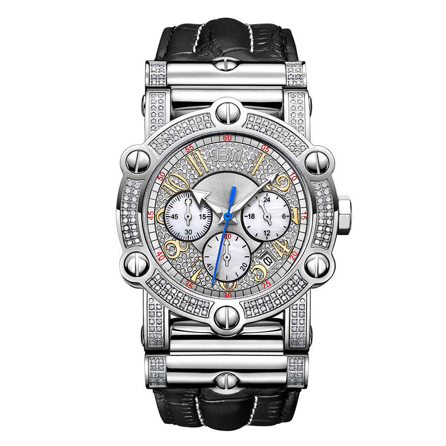 Silver-tone stainless steel case with a black leather strap. Silver silver-tone crystal set bezel. Silver dial with silver-tone arrow-shaped hands and Arabic numeral hour markers. Minute markers around the outer rim. Dial Type: Analog. Luminescent hands. Date display between 4 and 5 o'clock position. Chronograph - three sub-dials displaying: 60 second, 60 minute and 24 hour. Hattori Caliber VD53 quartz movement. Scratch resistant mineral crystal. Solid case back. Round case shape, case size: 42 mm, case thickness: 14 mm. Band width: 30 mm, band length: 8.5 inches. Butterfly clasp. Water resistant at 50 meters / 165 feet. Functions: chronograph, date, GMT, second time zone, hour, minute, second. Additional Info: 196 diamonds - 1.96 ctw. Dress watch style. Watch label: Japan Movt. JBW Mens 10 YR Anniversary Phantom 1.96 ctw Diamond Chronograph Watch JB-6215-10A.