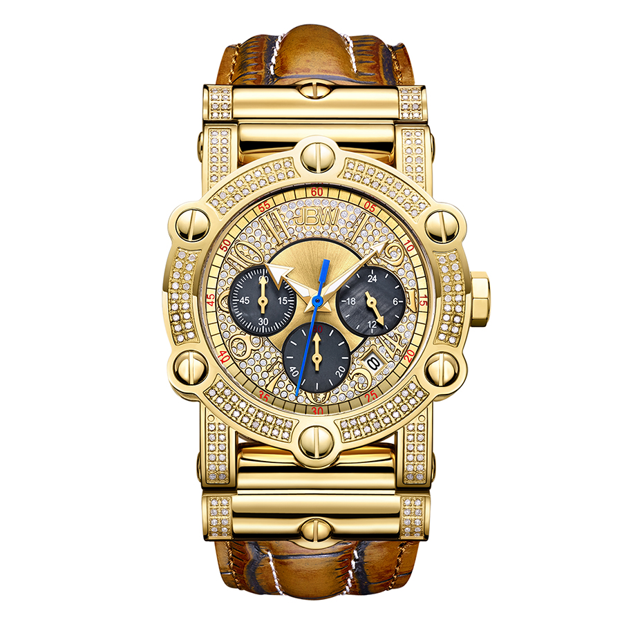 Gold-tone stainless steel case with a brown leather strap. Silver gold-tone stainless steel set with diamonds bezel. Gold diamond-set dial with luminous gold-tone hands and Arabic numeral hour markers. Minute markers around the outer rim. Dial Type: Analog. Luminescent hands. Date display between 4 and 5 o'clock position. Chronograph - three grey sub-dials displaying: 60 second, 60 minute and 24 hour. Hattori caliber VD53 quartz movement. Scratch resistant mineral crystal. Solid case back. Round case shape. Case size: 42 mm. Case thickness: 14 mm. Band width: 30 mm, band length: 8.5 inches. Butterfly clasp. Water resistant at 50 meters / 165 feet. Functions: chronograph, date, GMT, second time zone, hour, minute, second. Additional Info: 196 diamonds - 1.96 ctw. Dress watch style. Watch label: Japan Movt. JBW Mens 10 YR Anniversary Phantom 1.96 ctw Diamond Chronograph Watch JB-6215-10C.