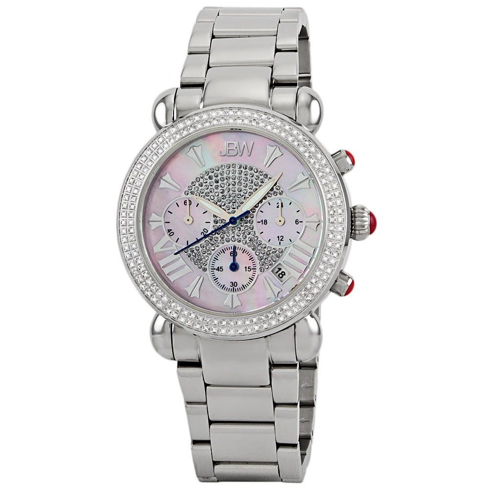 Silver-tone stainless steel case with a silver-tone stainless steel bracelet. Fixed silver-tone diamond set bezel. Mother of pearl dial with silver-tone hands and Roman numeral / index hour markers. Dial Type: Analog. Luminescent hands. Date display between 4 and 5 o'clock position. Chronograph - three sub-dials displaying: 60 second, 60 minute and 24 hour. Hattori Caliber VD53 quartz movement. Scratch resistant mineral crystal. Pull / push crown. Solid case back. Round case shape, case size: 38 mm, case thickness: 13 mm. Band width: 20 mm, band length: 7.5 inches. Deployment clasp. Water resistant at 50 meters / 165 feet. Functions: chronograph, date, hour, minute, second. Additional Info: total diamonds: 160. Victory Series. Dress watch style. Watch label: Japan Movt. Item Variations: 6210 160 C, 6210.160.C, 6210160C. JBW Victory Chronograph Diamond Mother of Pearl Dial Steel Ladies Watch JB-6210-160-C.
