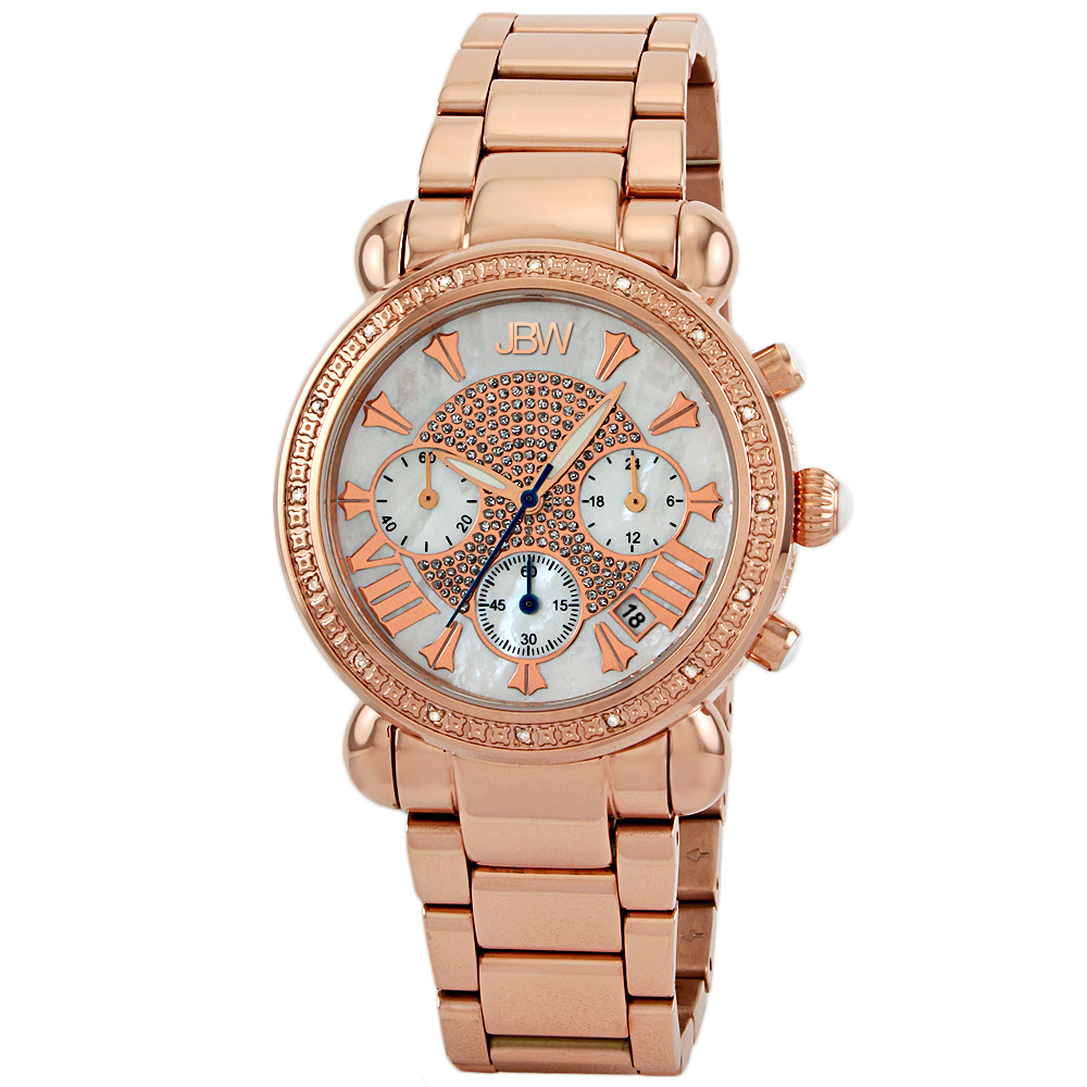 Rose gold-plated stainless steel case with a rose gold-plated stainless steel bracelet. Fixed diamond bezel. White mother of pearl dial with rose gold-tone hands and Roman numeral / index hour markers. Dial Type: Analog. Date display between 4 and 5 o'clock position. Chronograph - three sub-dials displaying: 60 second, 60 minute and 24 hour. VD53 quartz movement. Scratch resistant mineral crystal. Pull / push crown. Solid case back. Case size: 37 mm. Case thickness: 10.5 mm. Round case shape. Band width: 20 mm. Band length: 7.5 inches. Deployment clasp. Water resistant at 50 meters / 165 feet. Functions: chronograph, date, hour, minute, second. Additional Info: total diamonds: 16. Dress watch style. Item Variations: JB 6210 K, JB.6210.K, JB6210K. JBW Victory Chronograph Mother of Pearl Dial Rose Gold-Plated Diamond Ladies Watch JB-6210-K.