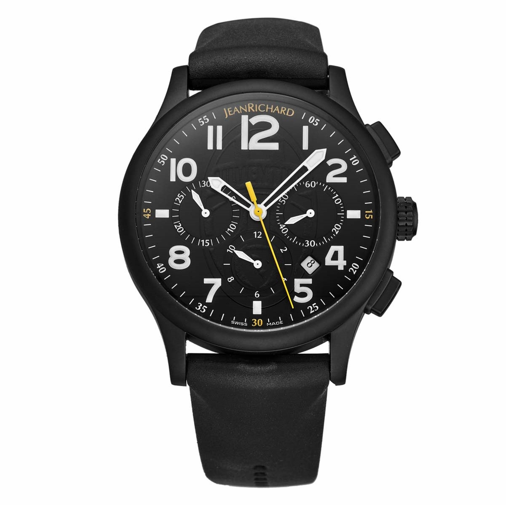 Black stainless steel case with a black rubber strap. Fixed stainless steel bezel. Black dial with silver-tone hands and Arabic numeral hour markers. Dial Type: Analog. Date display between 4 and 5 o'clock position. Chronograph - three sub-dials displaying: 60 second, 30 minute and 12 hours. Automatic movement with a 38-hour power reserve. Scratch resistant sapphire crystal. Solid case back. Round case shape, case size: 43 mm, case thickness: 13 mm. Band width: 21 mm, band length: 8 inches. Stainless steel clasp. Water resistant at 100 meters / 330 feet. Functions: chronograph, date, hour, minute, second. Watch label: Swiss Made. Item Variations: 32112 13 128 AC6, 32112.13.128.AC6, 3211213128AC6. Jean Richard JR Bressel Classic Chronograph for Juventus Watch 32112-13-128-AC6.