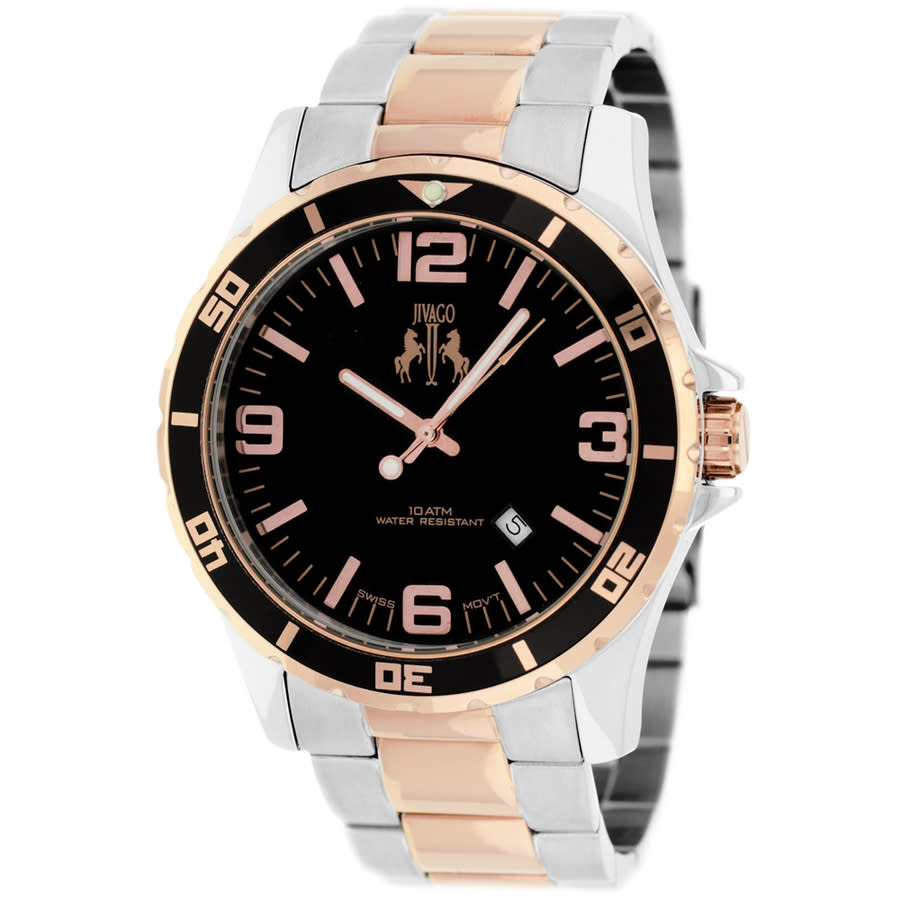 Silver-tone stainless steel case with a two-tone (silver-tone and rose gold-tone) stainless steel bracelet. Fixed black stainless steel bezel. Black dial with rose gold-tone hands and index hour markers. Minute markers around the outer rim. Dial Type: Analog. Luminescent hands. Date display between 4 and 5 o'clock position. Quartz movement. Scratch resistant mineral crystal. Round case shape, case size: 47 mm. Band width: 24 mm. Deployment with push button release clasp. Water resistant at 100 meters / 330 feet. Functions: date, hour, minute, second. Ultimate Series. Fashion watch style. Jivago Ultimate Quartz Black Dial Mens Watch JV6118.