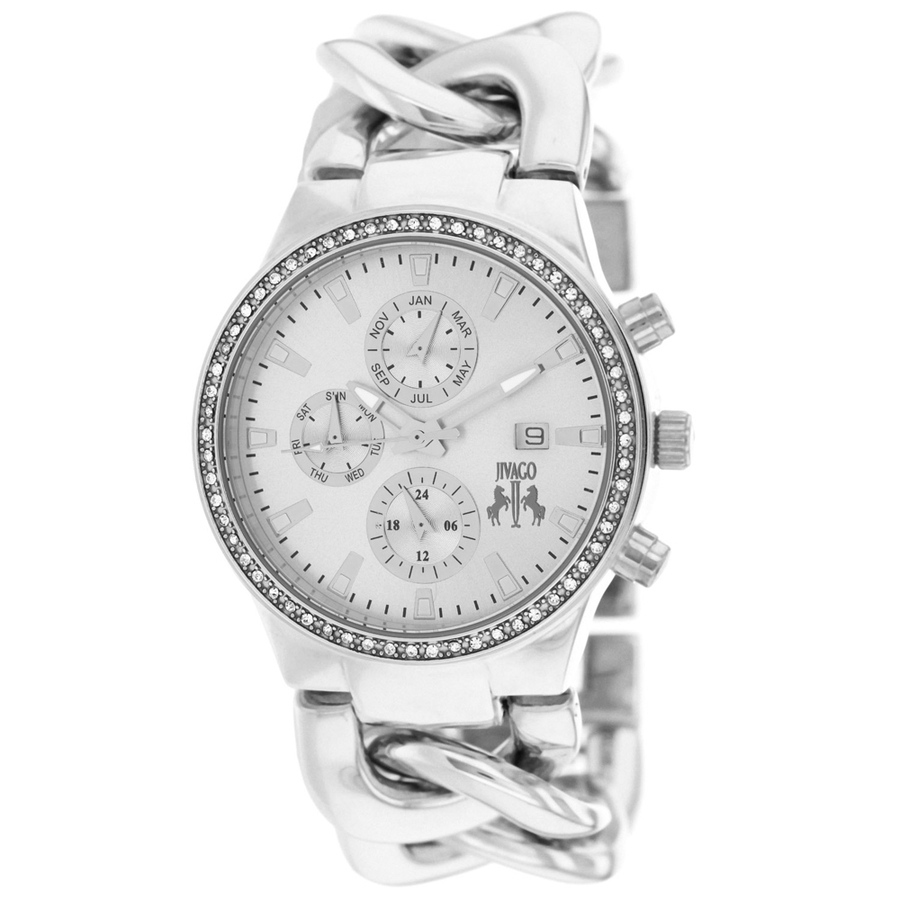 Stainless steel case with a stainless steel bracelet. Fixed silver-tone bezel set with crystals. Silver dial with luminous silver-tone hands and index hour markers. Minute markers around the outer rim. Dial Type: Analog. Luminescent hands and markers. Date display at the 3 o'clock position. Three multi-function sub-dials displaying: day of the week, month, and 24 hours. Quartz movement. Scratch resistant mineral crystal. Pull / push crown. Solid case back. Case size: 38 mm. Case thickness: 11 mm. Round case shape. Band width: 24 mm. Jewelry clasp. Water resistant at 30 meters / 100 feet. Functions: date, day, hour, minute, second, month. Dress watch style. Jivago Lev Multi-Function Silver Dial Ladies Ladies Watch JV1226.