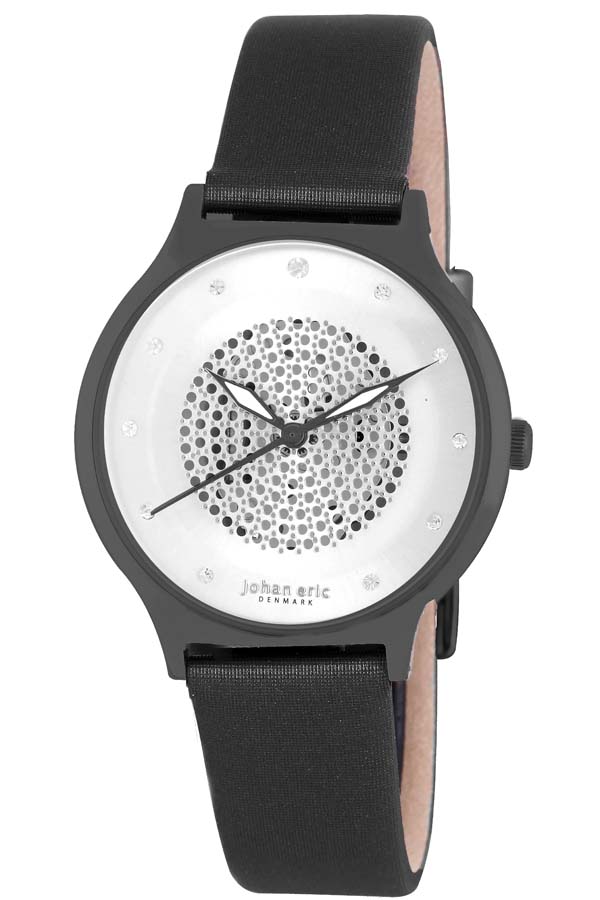 Silver-tone stainless steel case with a black satin bracelet. Fixed bezel. Silver dial with silver-tone hands and swarvoski crystal index hour markers. Dial Type: Analog. Luminescent hands. Quartz movement. Scratch resistant mineral crystal. Case diameter: 35 mm. Case thickness: 10 mm. Round case shape. Band width: 15.5 mm. Buckle clasp. Water resistant at 30 meters (100 feet). Functions: hour, minute, second. Johan Eric Orstead Round Silver-tone Steel Silver Sunray Dial Swarovski Crystal Ladies Watch JE1600-13-007.