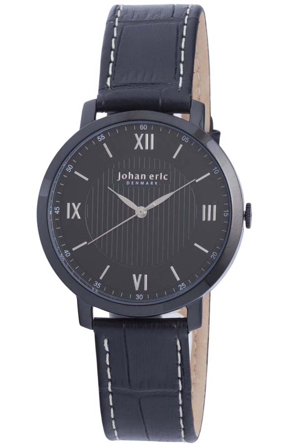 Black IP stainless steel case with a black calfskin leather strap. Fixed bezel. Black dial with silver-tone hands and Roman/index hour markers. Dial Type: Analog. Quartz movement. Miyota gl30 engine. Scratch resistant mineral crystal. Case diameter: 40 mm. Case thickness: 8 mm. Round case shape. Band width: 18 mm. Buckle clasp. Water resistant at 30 meters (100 feet). Functions: hour, minute, second. Johan Eric Koge Round Black IP Steel Black Dial Brown Leather Watch JE1700-13-007.