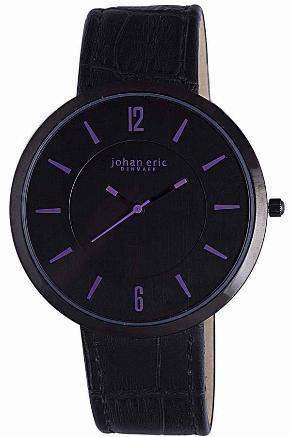 Black IP stainless steel case with a black calfskin leather strap. Fixed bezel. Black dial with black and purple hands and Arabic/index hour markers. Dial Type: Analog. Quartz movement. Miyota 2035 engine. Scratch resistant mineral crystal. Case diameter: 41 mm. Case thickness: 7.5 mm. Round case shape. Band width: 19 mm. Buckle clasp. Water resistant at 30 meters (100 feet). Functions: hour, minute, second. Johan Eric Vejle Black Dial Black IP Steel Ladies Watch JE5001-13-007A.