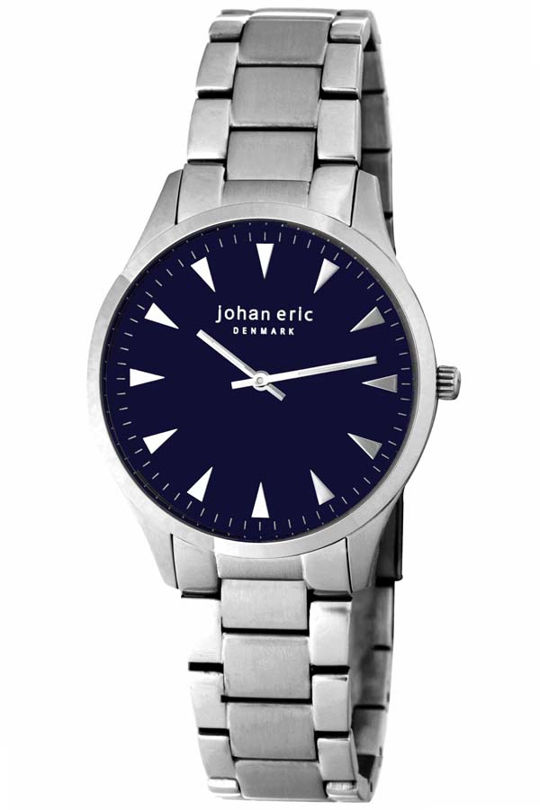 Silver-tone stainless steel case with a silver-tone stainless steel bracelet. Fixed bezel. Blue dial with silver-tone hands and index hour markers. Dial Type: Analog. Quartz movement. Miyota 2025 engine. Scratch resistant mineral crystal. Case diameter: 40 mm. Case thickness: 8 mm. Round case shape. Band width: 19 mm. Fold over clasp. Water resistant at 50 meters (165 feet). Functions: hour, minute. Johan Eric Helsingor Stainless Steel Blue Dial Bracelet Mens Watch JE9000-04-003B.