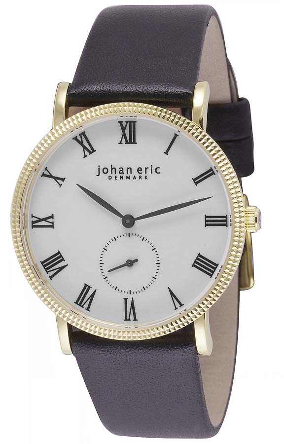 Gold-tone stainless steel case with a black leather strap. Fixed gold-tone stainless steel bezel. White dial with black hands and Roman numeral hour markers. Dial Type: Analog. One - 60 seconds subdial. Quartz movement. Scratch resistant mineral crystal. Push/pull crown. Solid case back. Round case shape, case size: 37 mm, case thickness: 7.5 mm. Band width: 19.5 mm, band length: 8.5 in. Buckle clasp. Water resistant at 30 meter / 99 feet. Functions: hour, minute, second. Casual watch style. Johan Eric Holstebro White Dial Mens Watch JE-H1000-02-001.