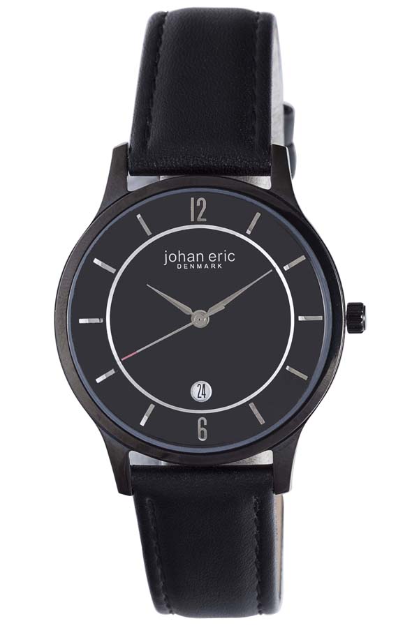 Black stainless steel case with a black leather strap. Fixed black stainless steel bezel. Black dial with silver-tone hands and index hour markers. Dial Type: Analog. Date display at the 6 o'clock position. Quartz movement. Scratch resistant mineral crystal. Push/pull crown. Solid case back. Round case shape, case size: 37 mm, case thickness: 8 mm. Band width: 17 mm, band length: 8.5 in. Buckle clasp. Water resistant at 30 meter / 99 feet. Functions: date, hour, minute, second. Casual watch style. Johan Eric Hobro Black Dial Mens Watch JE2003-13-007.