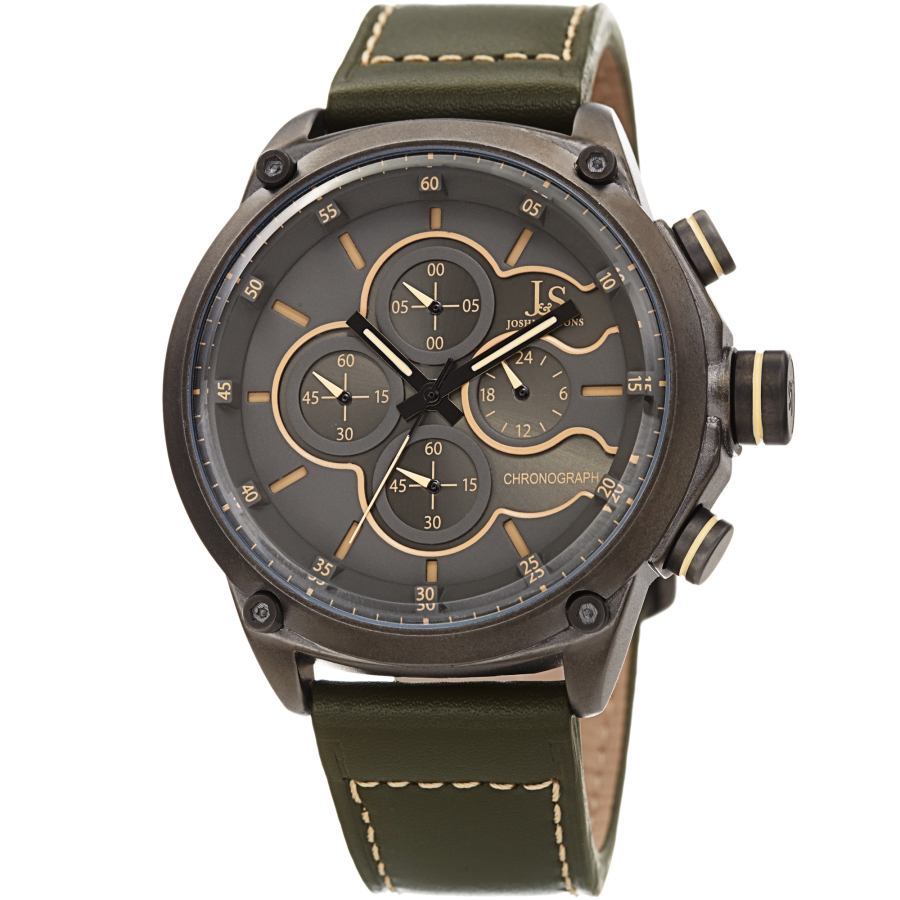 Composite metal case with a green leather strap. Fixed composite metal bezel. Grey dial with luminous black hands and index hour markers. Minute markers around the outer rim. Dial Type: Analog. Luminescent hands and markers. Chronograph - four sub-dials displaying: 60 second, 60 minute 1/10th of a second and 12 hour. Quartz movement. Scratch resistant mineral crystal. Pull / push crown. Solid case back. Round case shape. Case size: 48 mm. Case thickness: 14 mm. Band width: 22 mm. Band length: 8 inches. Tang clasp. Water resistant at 30 meters / 100 feet. Functions: chronograph, hour, minute, second. Fashion watch style. Joshua and Sons Chronograph Quartz Grey Dial Mens Watch JX133GN.