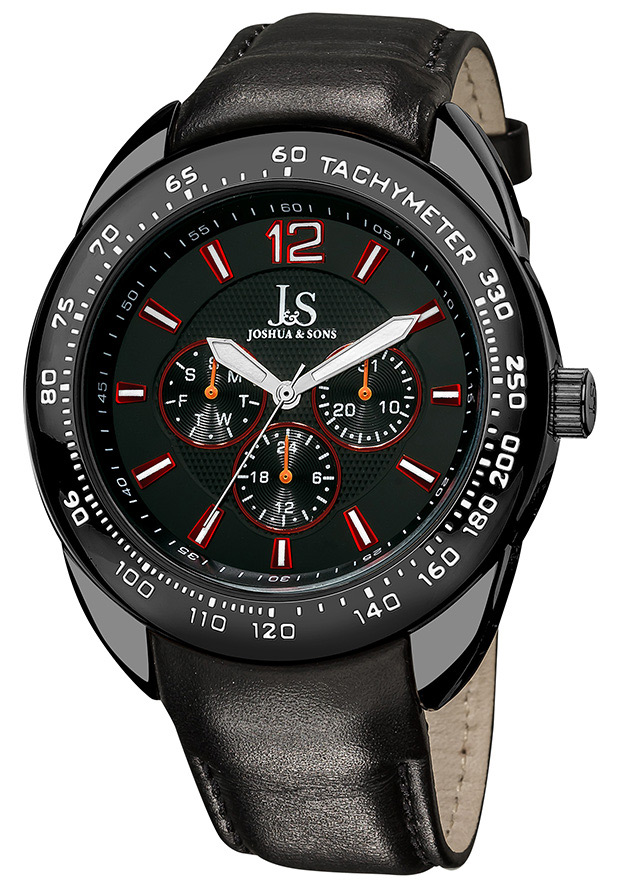 Black base metal case with a black leather strap. Fixed black base metal bezel showing tachymeter markings. Matt black dial with luminous silver-tone hands and index hour markers. An Arabic numeral appears at the 12 o'clock position. Minute markers around the outer rim. Dial Type: Analog. Luminescent hands and markers. Three multi-function sub-dials displaying: 24 hours, date and day of the week. Quartz movement. Scratch resistant mineral crystal. Pull / push crown. Snap down case back. Round case shape. Case size: 45 mm. Case thickness: 11 mm. Band width: 22 mm. Band length: 8 inches. Tang clasp. Water resistant at 30 meters / 100 feet. Functions: hour, minute, second. Additional Info: subdials: three, GMT, date, day. Casual watch style. Item Variations: JS 45 BK, JS.45.BK, JS45BK. Joshua and Sons Black Dial Black Leather Mens Watch JS-45-BK.