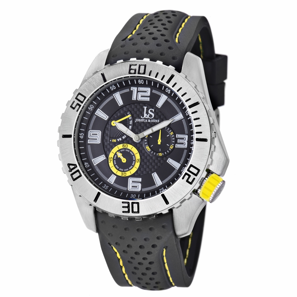 Silver-tone base metal case with a black silicone strap. Fixed silver-tone bezel. Black textured dial with luminous silver-tone hands and index hour markers. Arabic numerals mark the 3, 6, 9 and 12 o'clock positions. Minute markers around the outer rim. Dial Type: Analog. Luminescent hands and markers. Three multi-function sub-dials displaying: 60 seconds, date and day of the week. Quartz movement. Scratch resistant mineral crystal. Pull / push crown. Screw down case back. Case diameter: 52 mm. Case thickness: 13.5 mm. Round case shape. Band width: 24 mm. Band length: 8.5 inches. Tang clasp. Water resistant at 30 meters / 100 feet. Functions: date, day, hour, minute, second. Casual watch style. Joshua and Sons Multi-Function Black and Yellow Silicone Strap Mens Watch JS53YL.