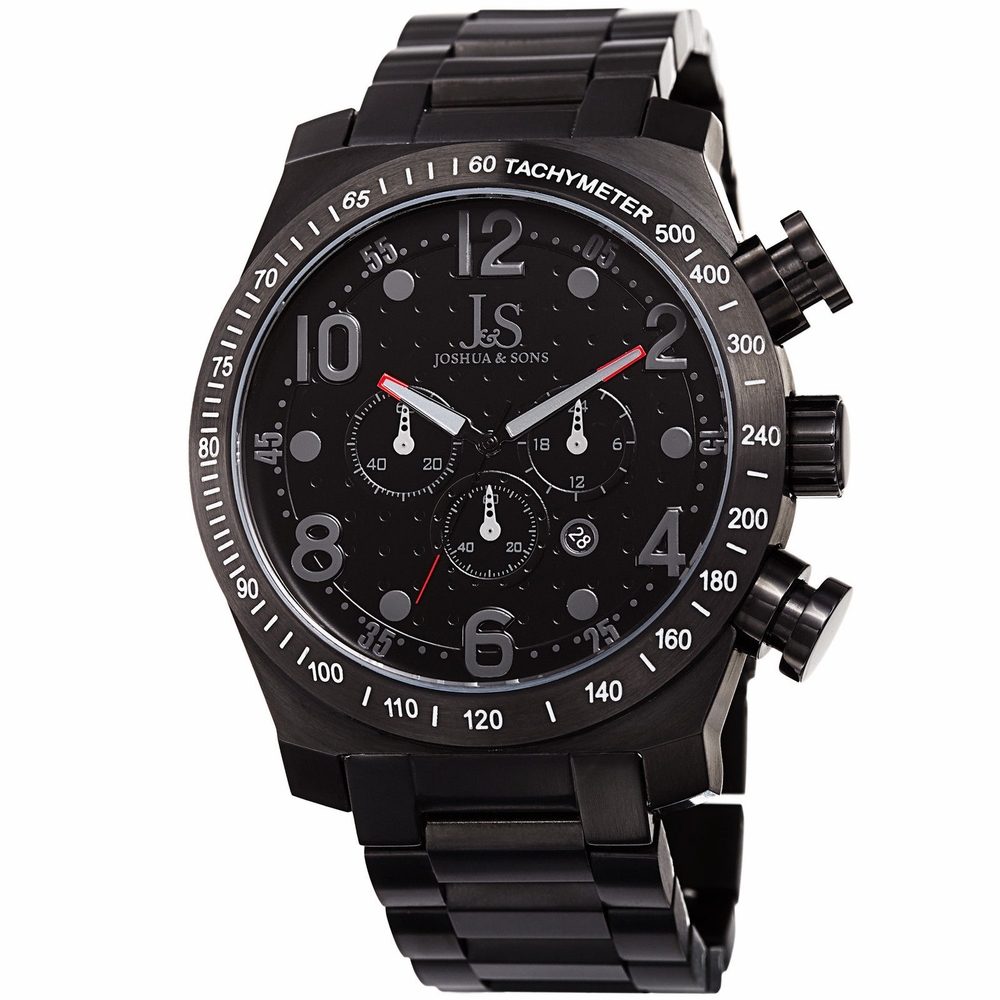 Black-plated stainless steel case and bracelet. Fixed black-plated bezel showing tachymeter markings. Black dial with luminous black hands and alternating Arabic numeral and dot hour markers. Arabic numeral minute markers (at 5 minute intervals). Minute markers around the outer rim. Dial Type: Analog. Luminescent hands. Date display between the 4 and 5 o'clock positions. Chronograph - three sub-dials displaying: 60 second, 60 minute and 24 hour. Quartz movement. Scratch resistant mineral crystal. Solid case back. Round case shape. Case size: 52 mm. Case thickness: 14 mm. Band width: 26 mm. Fold over clasp with a push button release. Water resistant at 100 meters / 330 feet. Functions: chronograph, tachymeter, date, hour, minute, second. Dress watch style. Joshua and Sons Chronograph Quartz Black Dial Mens Watch JX127GY.