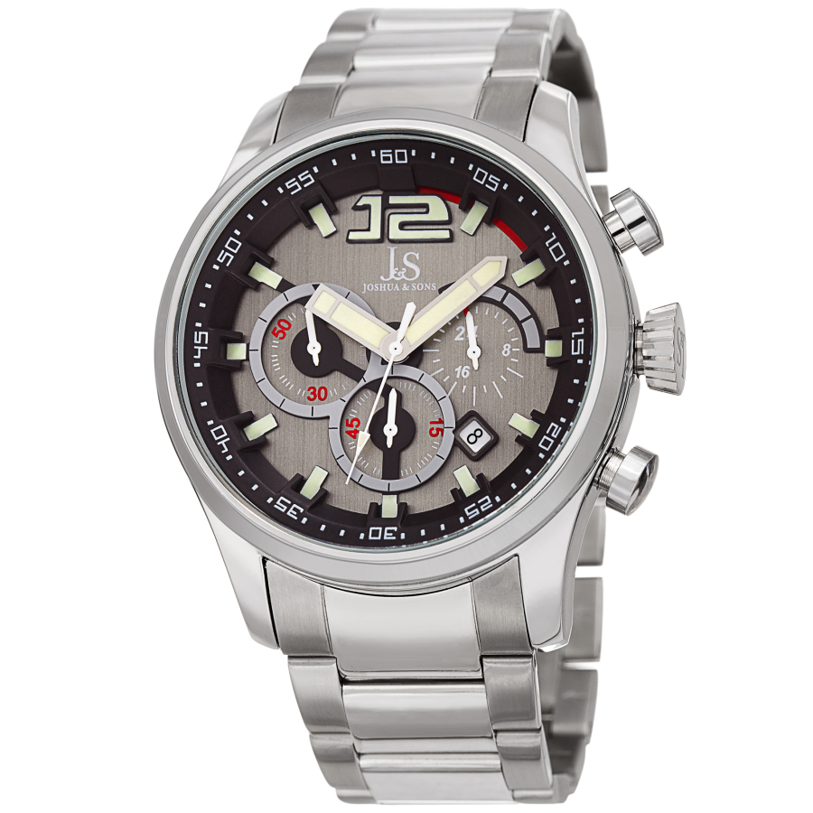 Silver-tone composite metal case with a stainless steel bracelet. Fixed silver-tone composite metal bezel. Grey dial with luminous silver-tone hands and index hour markers. An Arabic numeral appears at the 12 o'clock position. Minute markers around the outer rim. Dial Type: Analog. Luminescent hands and markers. Date display between the 4 and 5 o'clock positions. Chronograph - three sub-dials displaying: 60 minute, 60 second and 24 hour. Quartz movement. Scratch resistant mineral crystal. Pull / push crown. Solid case back. Round case shape. Case size: 46 mm. Case thickness: 13.45 mm. Band width: 24 mm. Band length: 8.5 inches. Fold over clasp with a safety release. Water resistant at 30 meters / 100 feet. Functions: date, hour, minute, second. Fashion watch style. Joshua and Sons Quartz Grey Dial Mens Watch JX134SSBK.