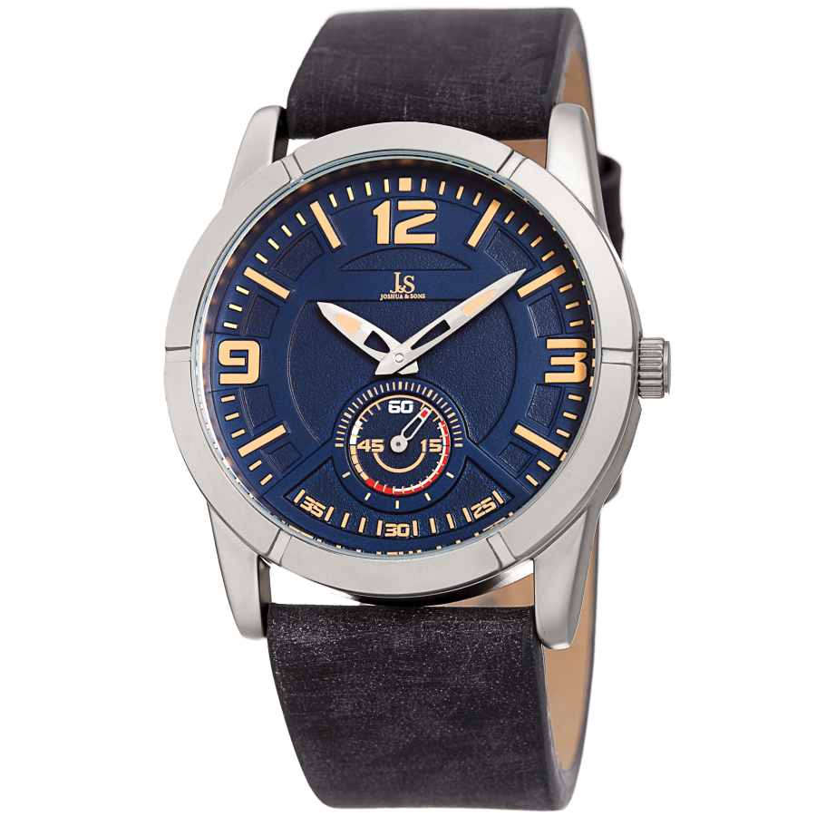 Silver-tone composite metal case with a grey leather strap. Fixed silver-tone composite metal bezel. Blue dial with luminous silver-tone hands and index hour markers. Arabic numerals mark the 3, 9 and 12 o'clock positions. Minute markers around the outer rim. Dial Type: Analog. Luminescent hands and markers. Small seconds sub-dial. Quartz movement. Scratch resistant mineral crystal. Pull / push crown. Solid case back. Round case shape. Case size: 42 mm. Case thickness: 11 mm. Band width: 24 mm. Band length: 7.5 inches. Tang clasp. Water resistant at 30 meters / 100 feet. Functions: hour, minute, second. Fashion watch style. Joshua and Sons Quartz Blue Dial Mens Watch JX135SSBU.