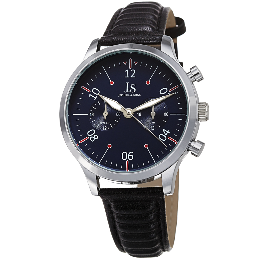 Silver-tone composite metal case with a black leather strap. Fixed silver-tone composite metal bezel. Blue dial with luminous silver-tone hands and alternating Arabic numeral and index hour markers. Minute markers around the outer rim. Dial Type: Analog. Luminescent hands and markers. Two sub-dials displaying: dual time and 24 hour. Quartz movement. Scratch resistant mineral crystal. Pull / push crown. Solid case back. Round case shape. Case size: 43 mm. Case thickness: 10 mm. Band width: 20 mm. Band length: 8 inches. Tang clasp. Water resistant at 30 meters / 100 feet. Functions: hour, minute. Fashion watch style. Joshua and Sons Quartz Blue Dial Mens Watch JX146SSBK.