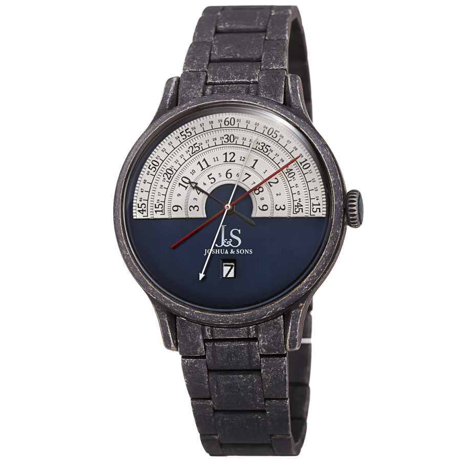Black composite case with a black stainless steel bracelet. Fixed black bezel. Blue dial with Arabic numeral hour markers. Dial Type: Analog. Date display at the 6 o'clock position. Quartz movement. Scratch resistant acrylic crystal. Pull / push crown. Solid case back. Round case shape, case size: 40 mm, case thickness: 13 mm. Band width: 18 mm, band length: 8.25 inches. Fold over clasp. Water resistant at 30 meters / 100 feet. Functions: date, hour, minute, second. Fashion watch style. Watch label: Japan Movt. Joshua and Sons Date Blue Dial Mens Watch JX153BKBU.