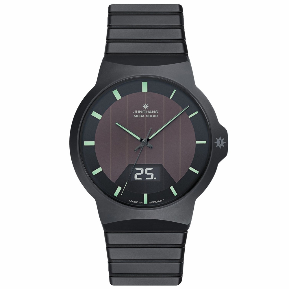 Matte black ceramic case and bracelet. Fixed matte black ceramic bezel. Black dial with luminous black hands and index hour markers. Dial Type: Analog-digital. Luminescent hands and markers. Digital date display at the 6 o'clock position. Solar J615.84 solar quartz movement. Scratch resistant sapphire crystal. Solid case back. Round case shape. Case size: 40.4 mm. Case thickness: 8.2 mm. Fold over clasp. Water resistant at 50 meters / 165 feet. Functions: date, hour, minute, second, solar-powered. Force Series. Sport watch style. Watch label: Made in Germany. Junghans Force Analog-Digital Black Dial Mega Solar Mens Watch 018/1938.44.