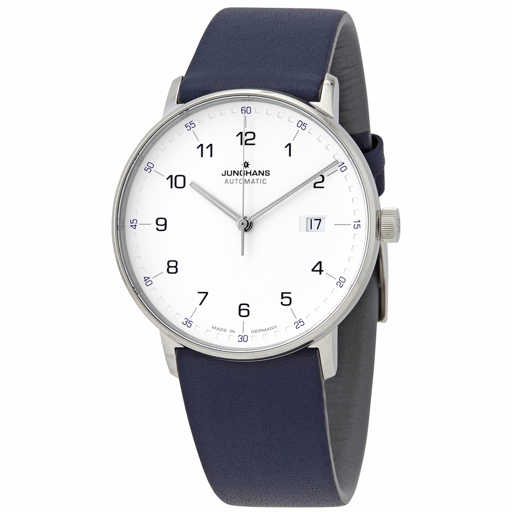 Stainless steel case with a blue (calfskin) leather strap. Fixed stainless steel bezel. Silver dial with silver-tone hands and Arabic numeral hour markers. Minute markers around the outer rim. Dial Type: Analog. Date display at the 3 o'clock position. Junghans calibre J800.2 automatic movement, based upon ETA 2824-2, bitting at 28800 vph, and has a power reserve of approximately 38 hours. Convex hard plexiglass crystal. Pull / push crown. Transparent case back. Round case shape. Case size: 39.1 mm. Case thickness: 9.5 mm. Band width: 21 mm. Tang clasp. Water resistant at 50 meters / 165 feet. Functions: date, hour, minute, second. Casual watch style. Watch label: Made in Germany. Junghans Form A Automatic Silver Dial Mens Watch 027/4735.00.