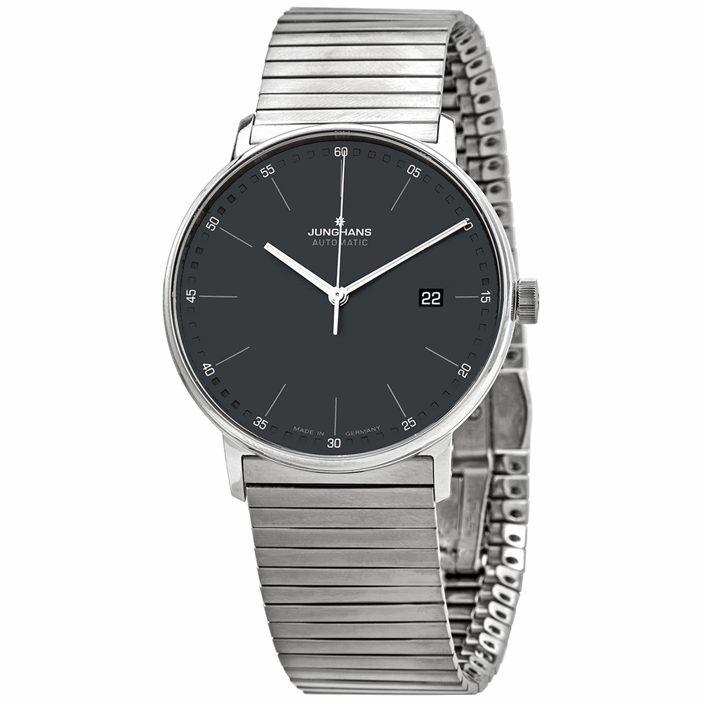 Stainless steel case with a stainless steel bracelet. Fixed stainless steel bezel. Anthricite dial with luminous silver-tone hands and index hour markers. Minute markers around the outer rim. Dial Type: Analog. Luminescent hands. Date display at the 3 o'clock position. Junghans calibre J800.2 automatic movement with a 38-hour power reserve. Scratch resistant sapphire crystal. Pull / push crown. Transparent case back. Round case shape. Case size: 39.1 mm. Case thickness: 9.75 mm. Band width: 21 mm. Fold over clasp with a push button release. Water resistant at 50 meters / 165 feet. Functions: date, hour, minute, second. Form A Series. Dress watch style. Watch label: Made in Germany. Junghans Form A Automatic Anthricite Dial Watch 027/4833.44.