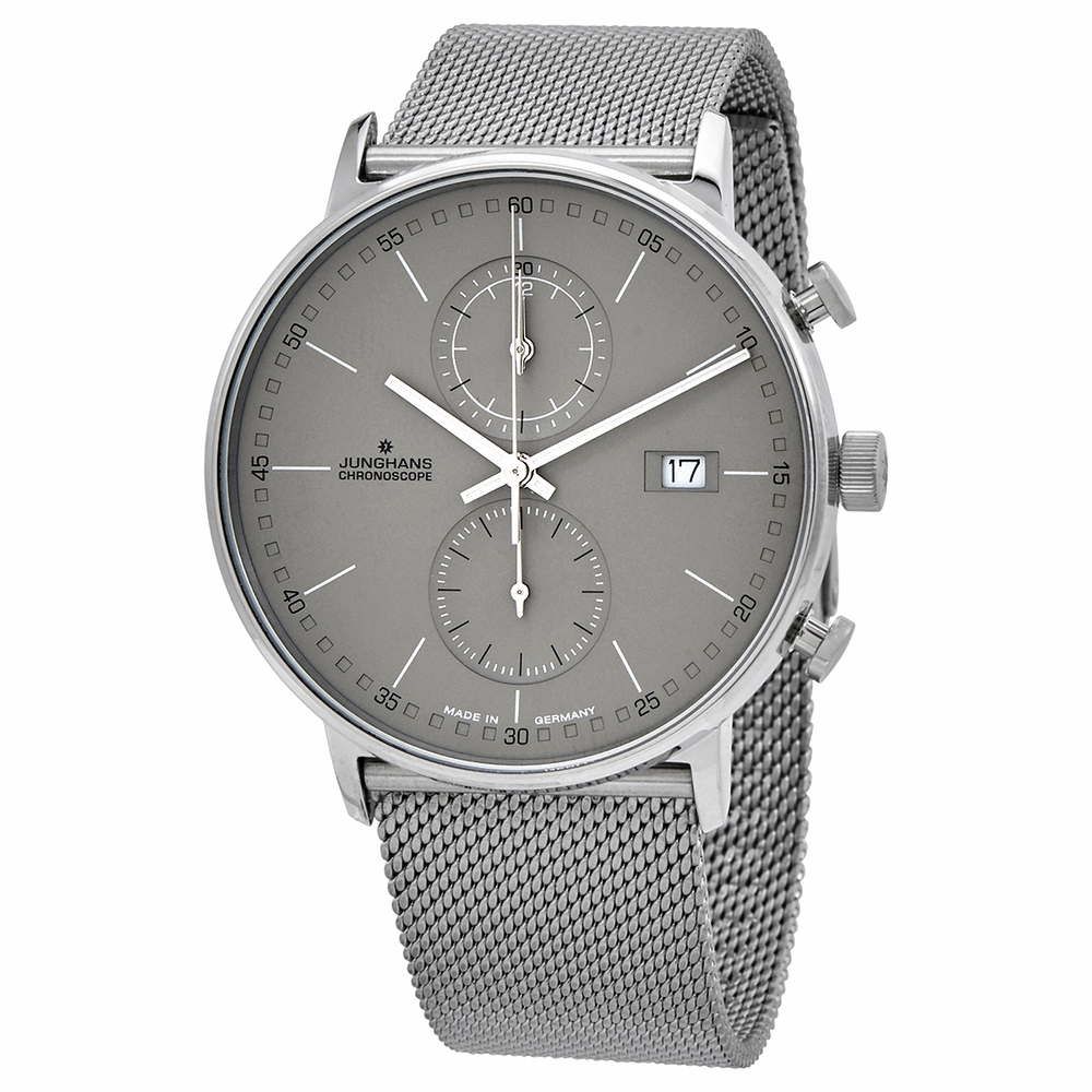 Silver-tone stainless steel case with a silver-tone stainless steel mesh bracelet. Fixed bezel. Light grey dial with silver-tone hands and Arabic numeral hour markers. Minute markers around the outer rim. Dial Type: Analog. Date display at the 3 o'clock position. Chronograph - sub-dials displaying: two - 60 second and 30 minute. Quartz movement. Scratch resistant sapphire crystal. Solid case back. Round case shape, case size: 40 mm, case thickness: 10.5 mm. Water resistant at 50 meters / 165 feet. Functions: chronograph, date, hour, minute, second. Watch label: Made in Germany. Junghans FORM C Chronograph Quartz Mens Watch 041/4878.44.