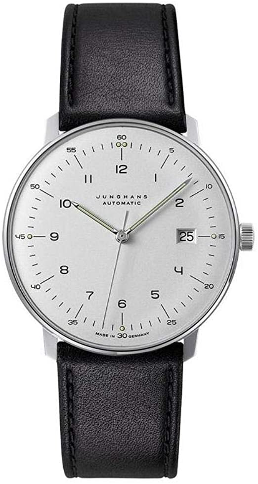 Stainless steel case with a black leather strap. Fixed stainless steel bezel. Matte silver dial with silver-tone hands and Arabic numeral / index hour markers. Minute markers. Arabic numeral minute markers (at 5 minute intervals) around the outer rim. Dial Type: Analog. Luminescent hands and markers. Date display at the 3 o'clock position. Automatic movement. Scratch resistant convex plexiglass crystal. Pull / push crown. Transparent case back. Round case shape. Case size: 38 mm. Case thickness: 10 mm. Band width: 20 mm. Tang clasp. Water resistant at splash resistant. Functions: date, hour, minute, second. Max Bill Series. Casual watch style. Watch label: Made in Germany. Junghans Max Bill Automatic Mens Watch 027/4700.04.