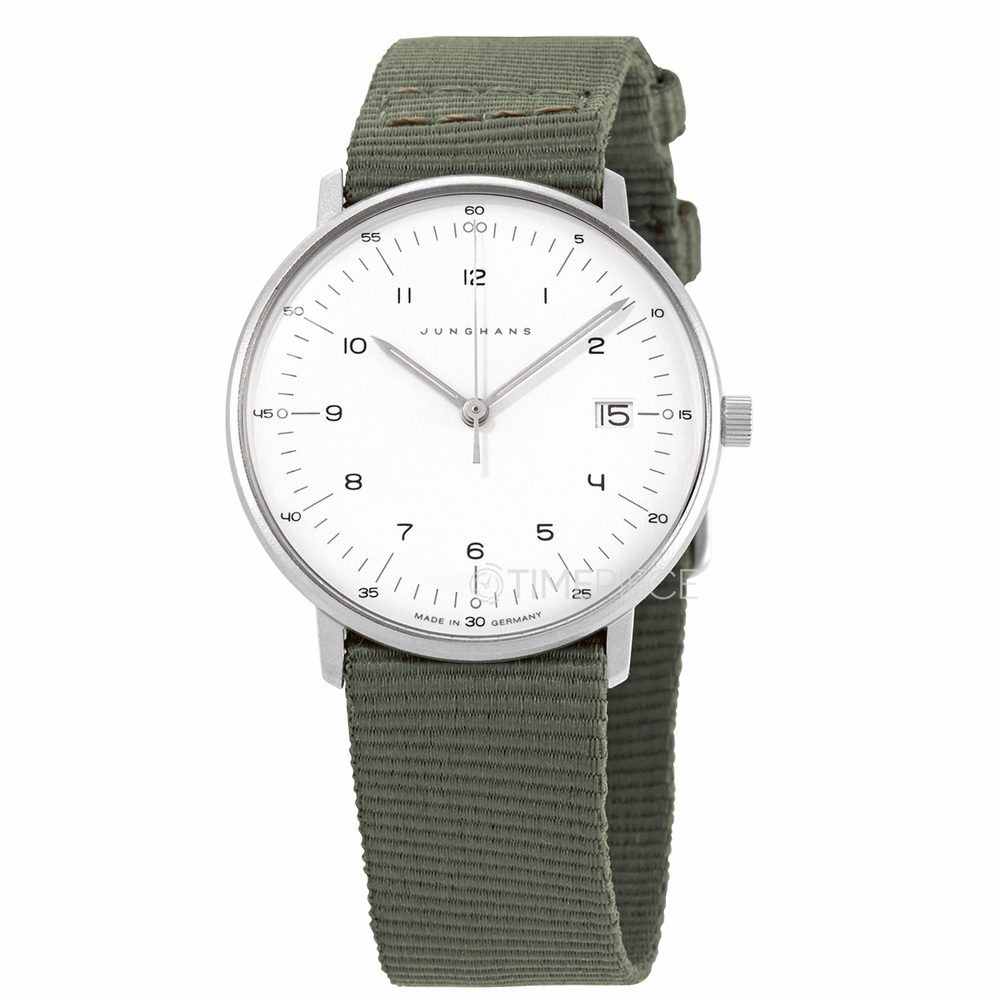 Silver-tone stainless steel case with a green textile strap. Fixed bezel. Matte white dial with silver-tone hands and Arabic numeral hour markers. Minute scale around the inner rim. Dial Type: Analog. Luminescent hands and markers. Date display at the 3 o'clock position. Quartz movement. Scratch resistant convex hard plexiglass crystal. Pull / push crown. Round case shape, case size: 32.7 mm, case thickness: 6.9 mm. Folding clasp. Water resistant at 30 meters / 100 feet. Functions: date, hour, minute, second. Max Bill Damen Series. Watch label: Made in Germany. Junghans Max Bill Damen Quartz Ladies Watch 047/4051.04.