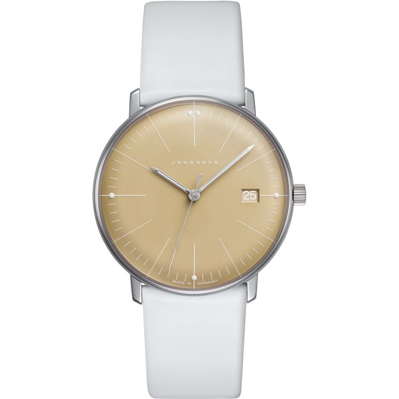 Silver-tone polished stainless steel case with a white calfskin leather strap. Fixed bezel. Polished honey dial with silver-tone hands and index hour markers. Dial Type: Analog. Luminescent hands and markers. Date display at the 3 o'clock position. J643.29 quartz movement. Scratch resistant plexiglass with sicralan coating crystal. Pull / push crown. Solid case back. Round case shape, case size: 32.7 mm, case thickness: 6.9 mm. Band width: 17 mm. Water resistant at 30 meters / 100 feet. Functions: date, hour, minute, second. Max Bill Series. Watch label: Made in Germany. Junghans Max Bill Quartz Ladies Watch 047/4657.00.