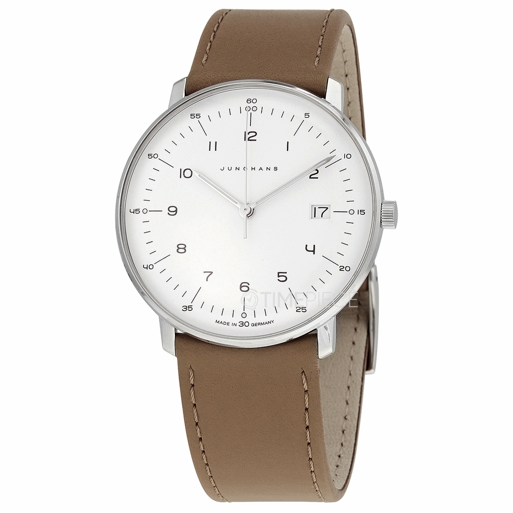 Stainless steel case with a beige (calfskin) leather strap. Fixed stainless steel bezel. Matt silver-plated dial with luminous silver-tone hands and Arabic numeral hour markers. Minute markers. Arabic numeral minute markers (at 5 minute intervals) around the outer rim. Dial Type: Analog. Luminescent hands and markers. Date display at the 3 o'clock position. J645.33 quartz movement. Scratch resistant plexiglass crystal with a sapphire coating. Pull / push crown. Solid case back. Round case shape, case size: 38 mm, case thickness: 7.9 mm. Band width: 20 mm. Tang clasp. Water resistant at 30 meters / 100 feet. Functions: date, hour, minute, second. Max Bill Series. Casual watch style. Watch label: Made in Germany. Junghans Max Bill Quartz Silver Dial Mens Watch 041/4562.04.