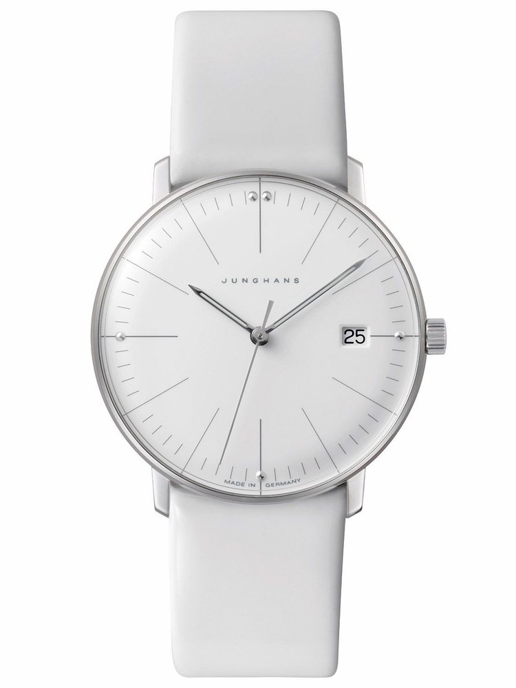 Stainless steel case with a white (calfskin) leather strap. Fixed stainless steel bezel. White dial with luminous silver-tone hands and index hour markers. Minute markers around the outer rim. Dial Type: Analog. Luminescent hands and markers. Date display at the 3 o'clock position. Quartz movement. Scratch resistant convex plexiglass crystal with a sicralan coating. Pull / push crown. Solid case back. Round case shape. Case size: 32.7 mm. Case thickness: 6.9 mm. Band width: 17 mm. Tang clasp. Water resistant at 30 meters / 100 feet. Functions: hour, minute, second. Max Bill Series. Casual watch style. Watch label: Made in Germany. Junghans Max Bill Quartz White Dial Ladies Watch 047/4355.00.