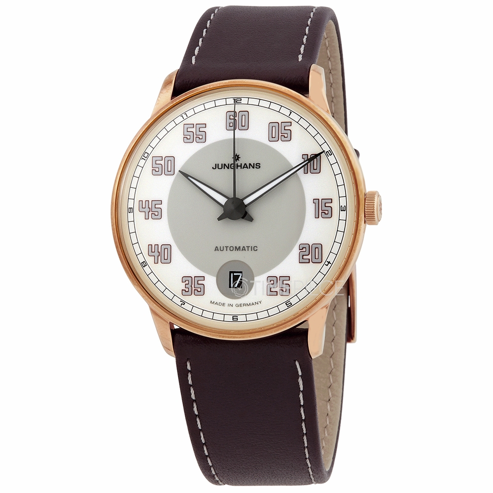 Rose gold PVD stainless steel case with a brown leather strap. Fixed rose gold PVD bezel. Sunburst effect dial with luminous black hands and small Arabic numeral hour markers. Arabic numeral minute markers (at 5 minute intervals). Minute markers around the outer rim. Dial Type: Analog. Date display at the 6 o'clock position. Caliber J800.1 automatic movement. Scratch resistant convex hard plexiglass crystal with a sicralan coating. Pull / push crown. Transparent case back. Round case shape. Case size: 38.4 mm. Case thickness: 9.9 mm. Tang clasp. Water resistant at 30 meters / 100 feet. Functions: date, hour, minute, second. Meister Driver Series. Casual watch style. Watch label: Made in Germany. Junghans Meister Driver Automatic Silver Dial Unisex Watch 027/7710.00.