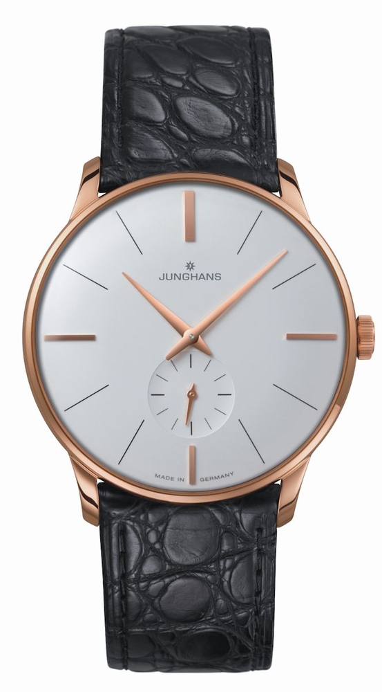 Rose gold-tone stainless steel case with a black louisiana alligator leather strap. Fixed bezel. Fine matte silver dial with rose gold-tone hands and index hour markers. Dial Type: Analog. One subdial displaying: one- small seconds. J815.1 hand wind movement. Scratch resistant convex hard plexiglass with sicralan crystal. Pull / push crown. Transparent see through case back. Round case shape, case size: 37.7 mm, case thickness: 7.3 mm. Band width: 20 mm. Water resistant at 30 meters / 100 feet. Functions: hour, minute, second. Meister Series. Watch label: Made in Germany. Junghans Meister Hand Wind Mens Watch 027/5202.00.