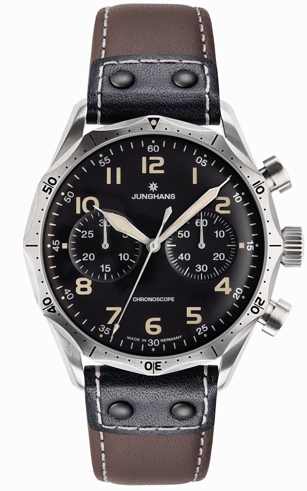 Silver-tone stainless steel case with a brown riveted leather strap. Bi-directional rotating bezel. Brown dial with silver-tone hands and Arabic numeral hour markers. Minute markers around the outer rim. Dial Type: Analog. Luminescent hands and markers. Chronograph - two sub-dials displaying: 60 second and 30 minute. J880.4 automatic movement with a 38-hour power reserve. Scratch resistant confex sapphire crystal crystal. Solid case back. Round case shape, case size: 43.3 mm, case thickness: 14.4 mm. Band width: 22 mm. Water resistant at 100 meters / 330 feet. Functions: chronograph, hour, minute, second. Meister Pilot Chronoscope Series. Watch label: Made in Germany. Junghans Meister Pilot Chronoscope Chronograph Automatic Brown Dial Mens Watch 027/3591.00.