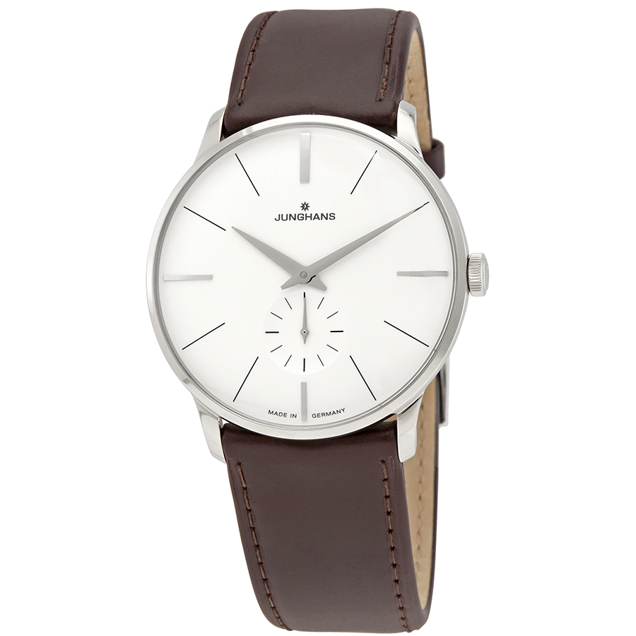 Silver-tone stainless steel case with a brown (horse-skin) leather strap. Fixed silver-tone stainless steel bezel. Fine matte silver plated dial with silver-tone dauphine-style shape hands and index hour markers. Dial Type: Analog. One - small second subdial. Junghans Calibre J815.1 Hand Wind movement, based upon ETA 7001, containing 17 Jewels, bitting at 21600 vph, and has a power reserve of approximately 42 hours. Scratch resistant plexiglass with sicralan coating crystal. Pull / push crown. Transparent case back. Round case shape, case size: 37.7 mm, case thickness: 7.3 mm. Band width: 20 mm. Buckle clasp. Water resistant at 30 meters / 100 feet. Functions: hour, minute, small second. Meister Series. Casual watch style. Watch label: Made in Germany. Junghans Meister Hand Wind Mens Watch 027/3200.00.
