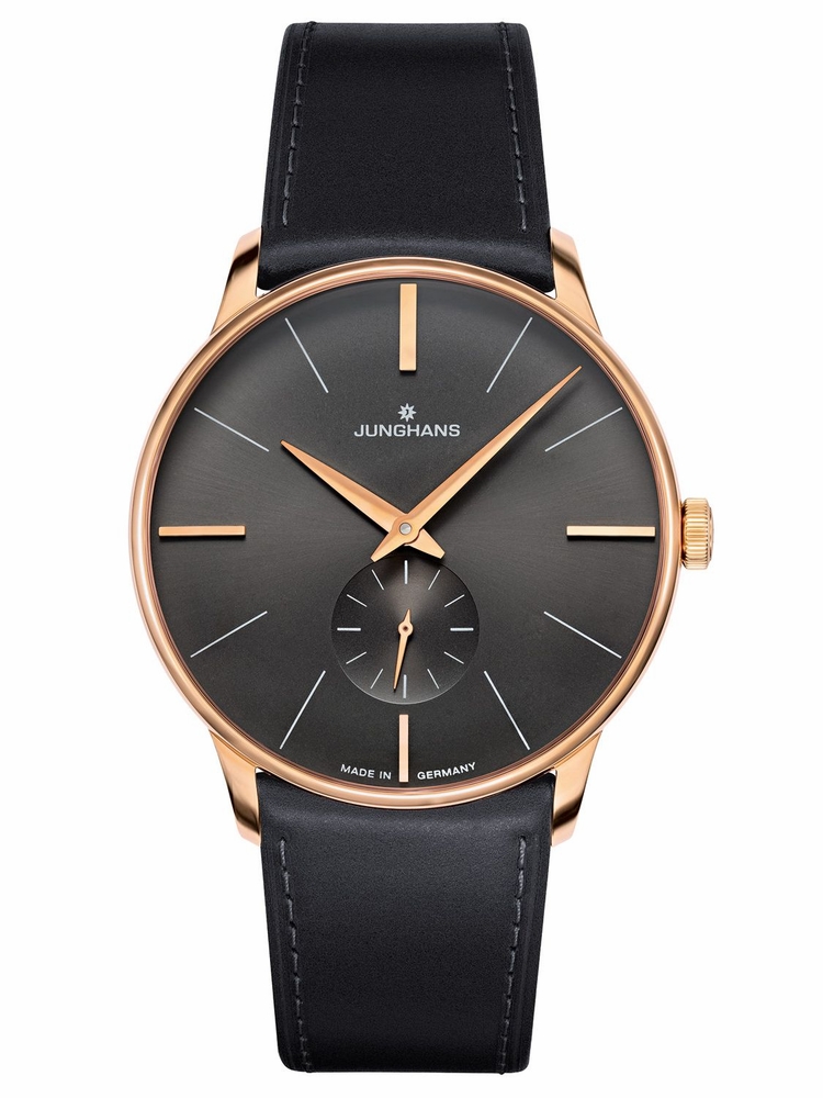 Rose gold PVD stainless steel case with a black leather strap. Fixed rose gold PVD bezel. Anthracite grey dial with rose gold-tone hands and index hour markers. Dial Type: Analog. One subdial displaying: small seconds. Junghans calibre J815.1 hand wind movement, based upon ETA 7001, containing 17 Jewels, bitting at 21600 vph, and has a power reserve of approximately 42 hours. Scratch resistant plexi-glass crystal with a sicralan coating. Pull / push crown. Transparent case back. Round case shape. Case size: 37.7 mm. Case thickness: 7.3 mm. Band width: 18 mm. Tang clasp. Water resistant at 30 meters / 100 feet. Functions: hour, minute. Meister Series. Luxury watch style. Watch label: Made in Germany. Junghans Meister Anthracite Grey Dial Mens Watch 027/5903.00.